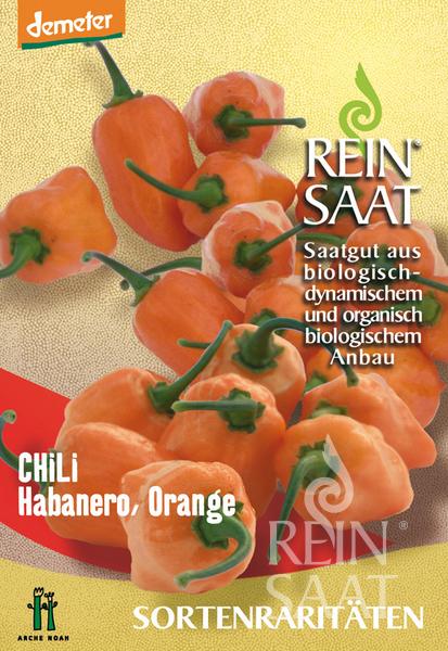 Der Habanero Orange von ReinSaat ist eine superscharfe Chilisorte, die von Grün auf ein leuchtendes Orange reift. Mit laternenförmigen, 6–7 cm langen Früchten präsentiert sie das typisch karibisch-fruchtige Aroma und eine intensive Schärfe.