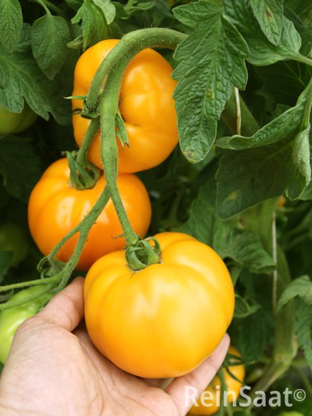 Orangefarbene, ertragreiche, indeterminante Fleischtomate aus der EHZ von ReinSaat. Die 150 – 250 g schweren Früchte haben eine feste, glatte Schale und fruchtig-süßes, saftig zart schmelzendes, schmackhaftes Fruchtfleisch. Gewächshaus und geschützter Anbau im Freiland.